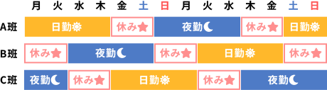 工場では、この勤務形態で日勤と夜勤を交互に行います。
